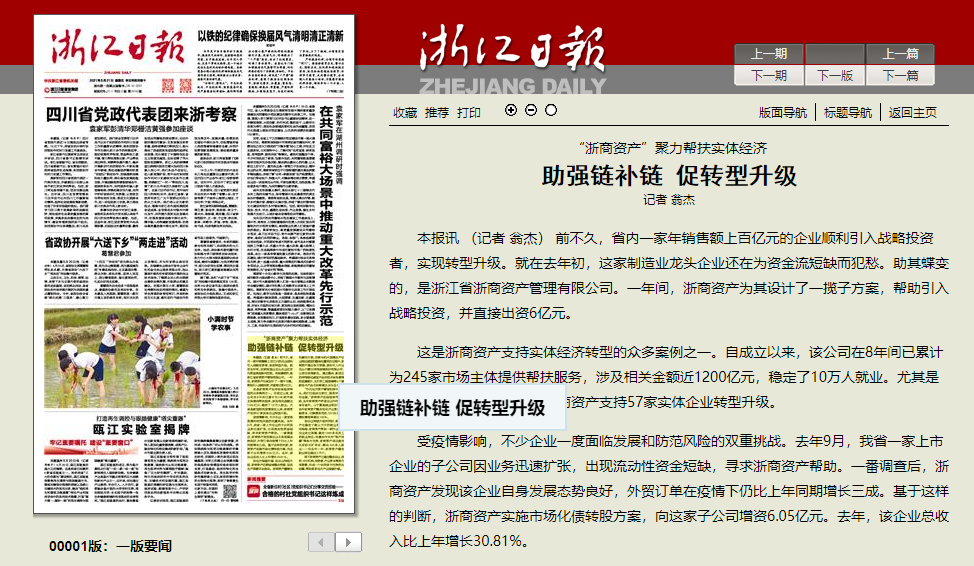 這是浙商資產支持實體經濟轉型的眾多案例之一。自成立以來,該公司在8年間已累計為245家市場主體提供幫扶服務,涉及相關金額近1200億元,穩(wěn)定了10萬人就業(yè)。尤其是新冠肺炎疫情發(fā)生以來,浙商資產支持57家實體企業(yè)轉型升級。