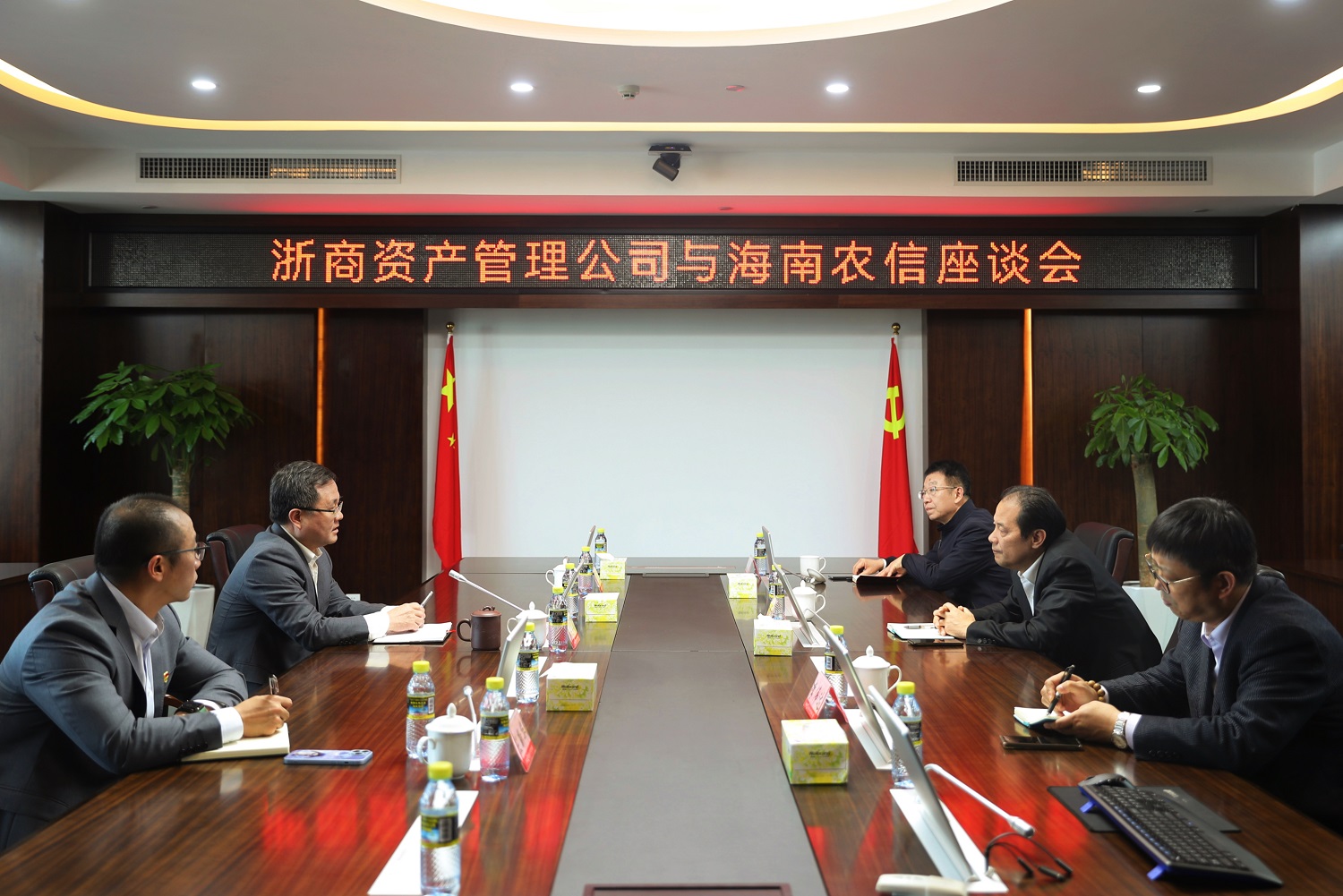 2月23日上午,孫建華一行與海南聯(lián)合資產(chǎn)董事長(zhǎng)張波,黨委副書記兼總經(jīng)理李賢俊等進(jìn)行座談交流,積極探討業(yè)務(wù)合作方向,共同探索地方AMC高質(zhì)量發(fā)展路徑。孫建華表示,自成立以來(lái),浙商資產(chǎn)深入貫徹落實(shí)浙江省委、省政府的安排部署,緊抓改革發(fā)展契機(jī),矢志踐行初心使命,履行國(guó)企擔(dān)當(dāng),深耕不良資產(chǎn)處置與經(jīng)營(yíng)主業(yè),設(shè)立了五大區(qū)域分公司,實(shí)現(xiàn)覆蓋全省、走向全國(guó)的區(qū)域布局,希望雙方開展常態(tài)化溝通交流,助力行業(yè)高質(zhì)量發(fā)展。張波對(duì)孫建華一行表示熱烈歡迎,并介紹了海南聯(lián)合資產(chǎn)歷史沿革、經(jīng)營(yíng)管理和業(yè)務(wù)布局等情況。他表示,一直以來(lái),浙商資產(chǎn)在業(yè)務(wù)模式、業(yè)務(wù)布局等方面先行先試,為行業(yè)轉(zhuǎn)型做出了有益探索,是海南聯(lián)合資產(chǎn)學(xué)習(xí)的對(duì)象;當(dāng)前,海南聯(lián)合資產(chǎn)致力于摸索出一條市場(chǎng)化道路,而浙商資產(chǎn)在市場(chǎng)化治理機(jī)制上引領(lǐng)行業(yè),實(shí)現(xiàn)了國(guó)企治理與市場(chǎng)化規(guī)律全方位融合,對(duì)于海南聯(lián)合資產(chǎn)進(jìn)一步推進(jìn)高質(zhì)量發(fā)展具有重要借鑒意義;自由貿(mào)易港的建設(shè)將為海南未來(lái)的發(fā)展帶來(lái)重大轉(zhuǎn)機(jī),希望與浙商資產(chǎn)開展多層次合作,形成資源和優(yōu)勢(shì)互補(bǔ),共同助力海南自貿(mào)港建設(shè)。