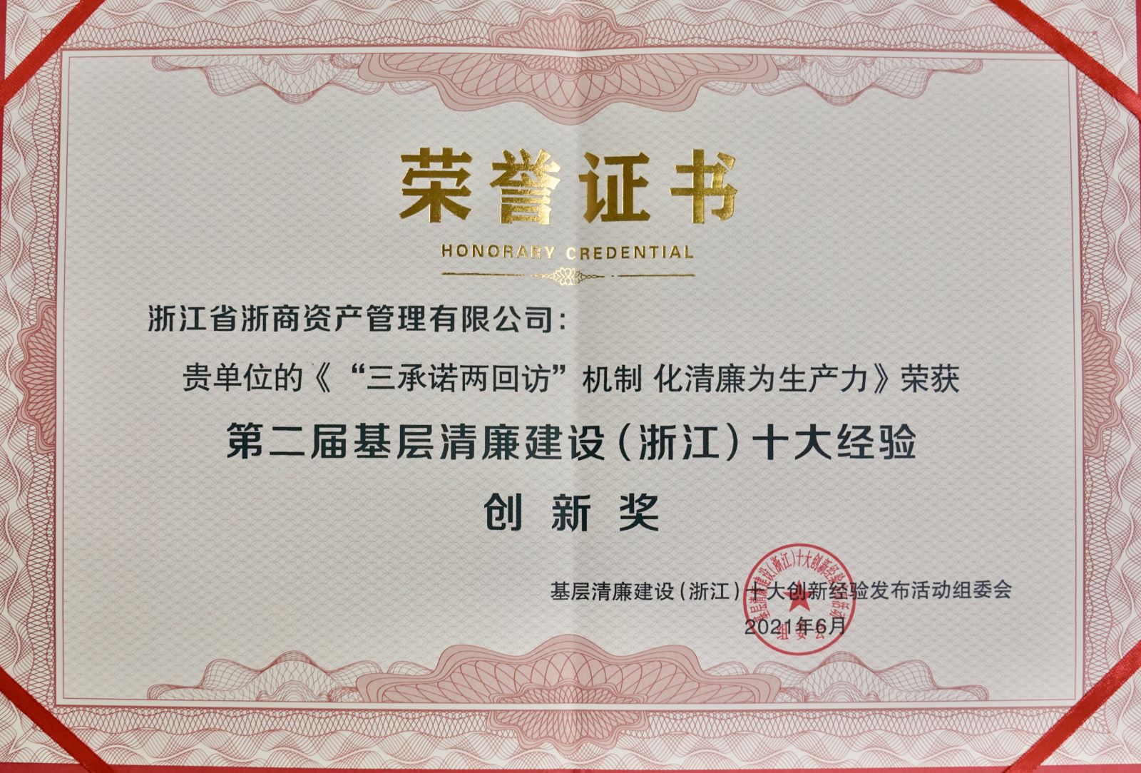 6月18日,由省紀委省監(jiān)委指導(dǎo),浙江日報報業(yè)集團、浙江大學(xué)主辦,《反腐敗導(dǎo)刊》雜志社、浙江大學(xué)廉政研究中心承辦的第二屆“基層清廉建設(shè)(浙江)十大經(jīng)驗”發(fā)布活動在杭州隆重舉行,浙商資產(chǎn)《“三承諾兩回訪”機制 化清廉為生產(chǎn)力》榮獲“創(chuàng)新獎”。